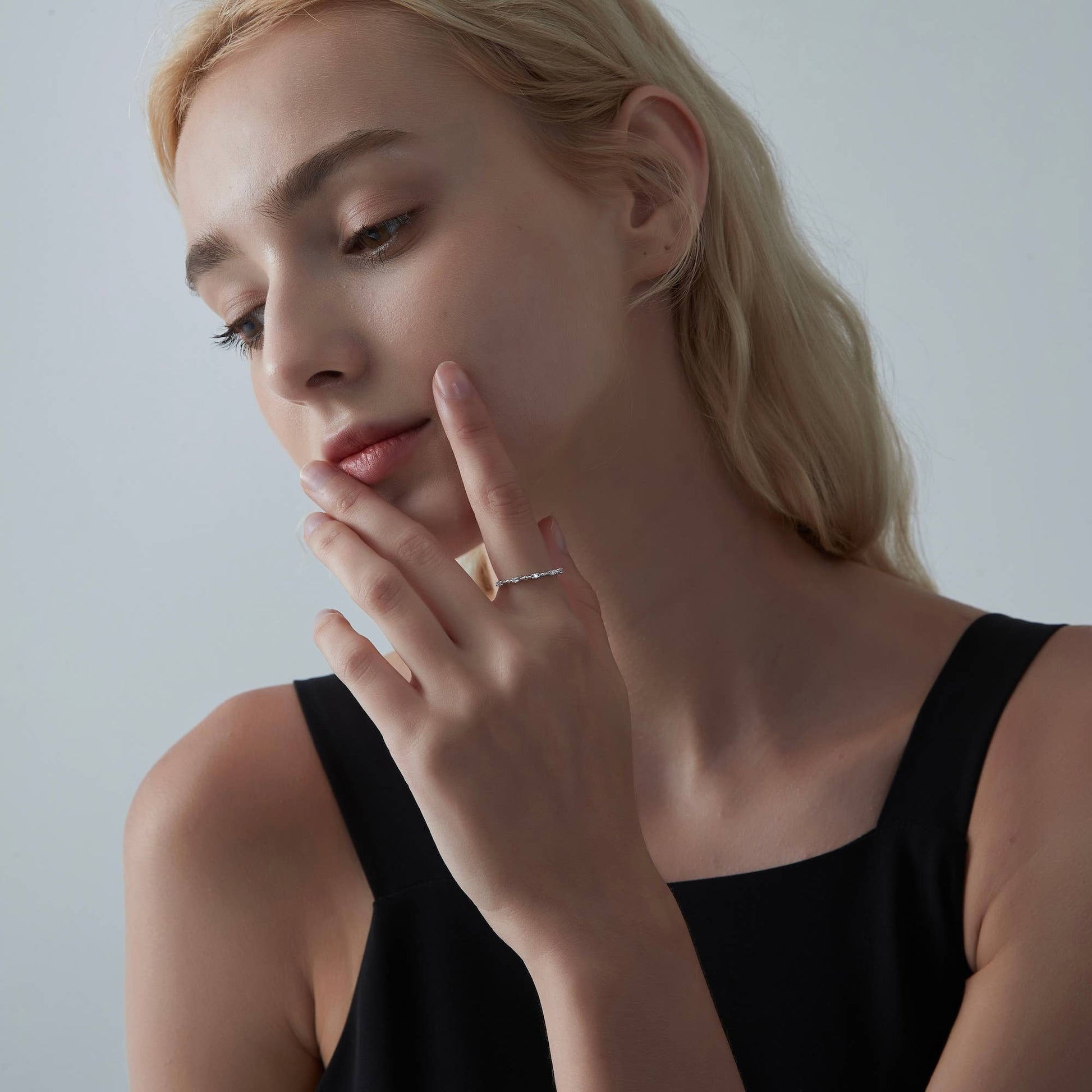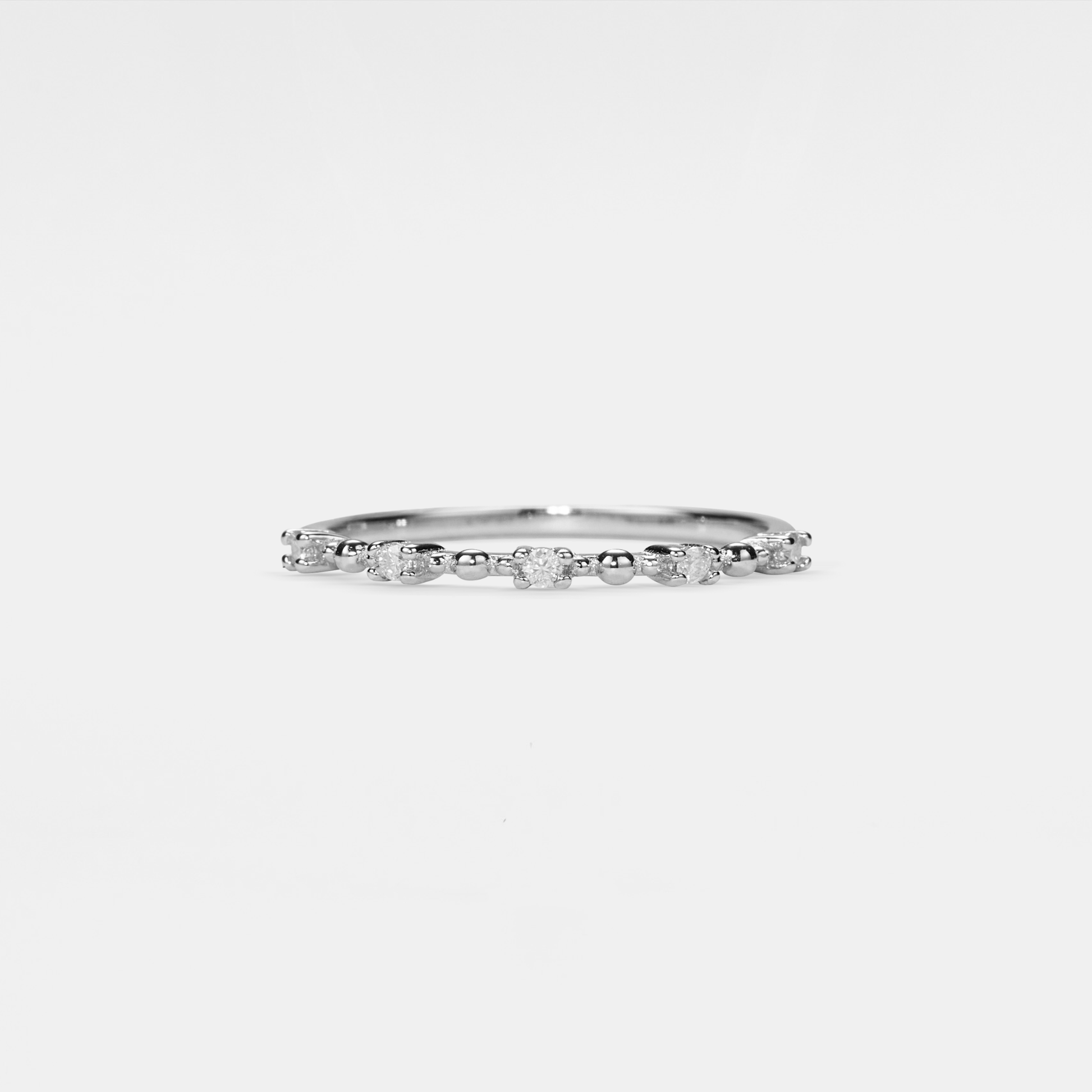 • Dimensions: 0.075 ct, Color D, VVS1 Moissanite, US size 4 1/2 - 9 available